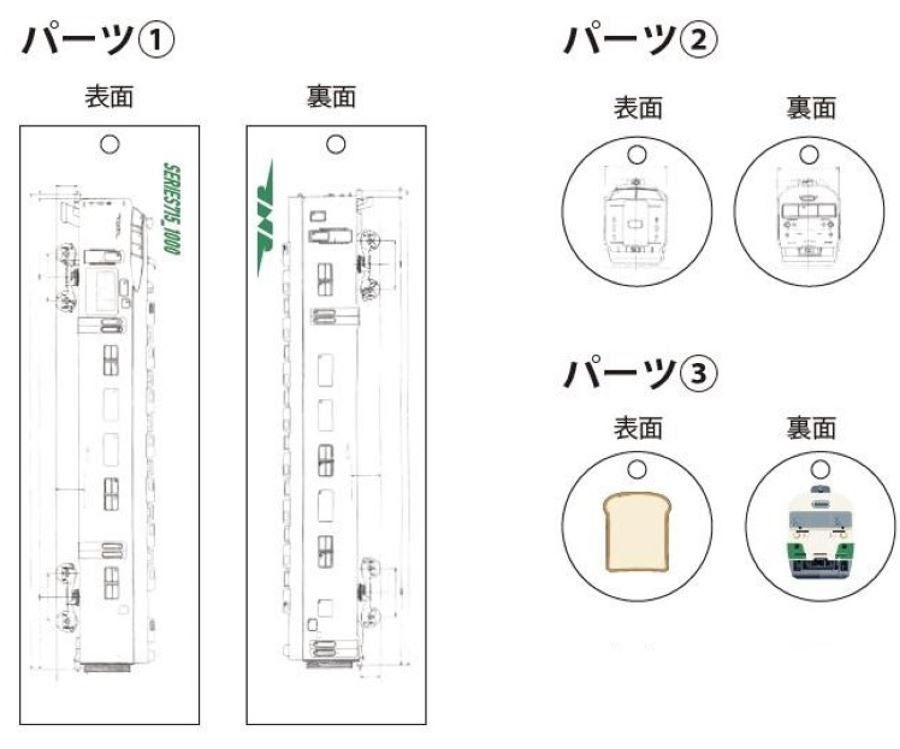 715系1000番代の先頭車体図を使用したアクリルキーホルダー。パーツには車両図面・イラストに加え、前面形状が平らで六角形の特徴的な断面が食パンに似ていることから、鉄道ファンの間で「食パン」と呼ばれ親しまれている愛称にちなんだ食パンのイラストを使用しています。車両図面と車両のカラーイラスト、食パンのイラストが3連で楽しめるキーホルダーです。