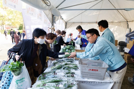 物販コーナーには、化学肥料や化学合成農薬の使用を低減させ、人と環境に配慮した鮮度抜群の野菜を提供する「JA兵庫六甲こうべ旬菜部会」など神戸市内で採れた新鮮野菜を扱うブースがラインナップ。新鮮でお買い得な野菜がずらりと並ぶブースは朝から大盛況でした。
