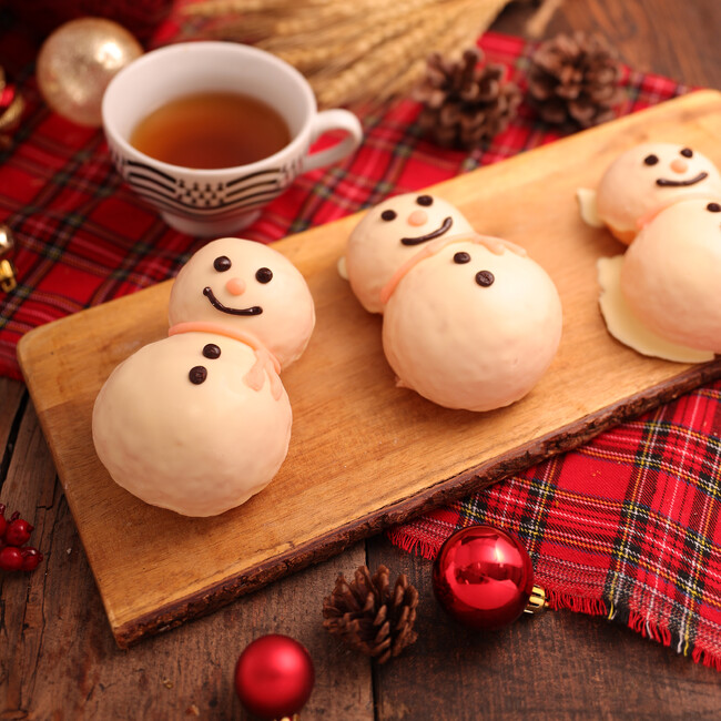 いちごの果汁を合わせた生地に、ホワイトチョコをコーティングして可愛らしい雪だるま型に仕上げました。