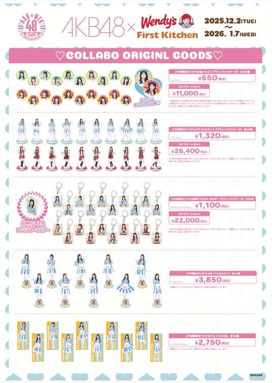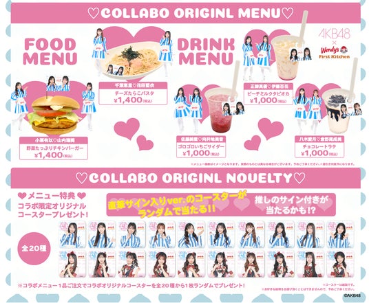ウェンディーズ・ジャパン株式会社及び、ファーストキッチン株式会社(所在地:東京都新宿区、代表取締役:紫関修)は、12月2日(火)より、ウェンディーズ・ ファーストキッチンとファーストキッチン(競馬場店を除く)にて、今年12月で20周年を迎える国民的アイドル『AKB48』とのコラボキャンペーンを開催します。コラボを記念して、AKB48のメンバーが考案したフレーバーポテト「和風だし味」を販売します。さらに、完全撮り下ろしビジュアルを使用した、オリジナルA4クリアファイル(全20種)と、お好きなフレーバーポテトMセット780円(税込)を1月7日(水)までの期間中、数量限定で販売します。数に限りがありますのでお早めにご来店ください。また、5店舗限定で店内装飾の実施や、限定メニュー・限定グッズを販売します。内容盛りだくさんな『AKB48』コラボをぜひお楽しみください。