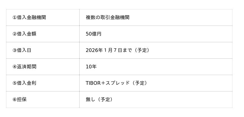 現時点では、複数の金融機関との間で融資条件等について協議を進めており、一部の金融機関からは融資実行に関する内諾を得ております。残余部分についても順次条件調整を進めており、取得価額相当額 (50億円)の資金調達を見込んでおります。金利、担保設定の有無及び融資シェア等の詳細条件については現在調整中であることから、確定次第、改めて開示いたします。