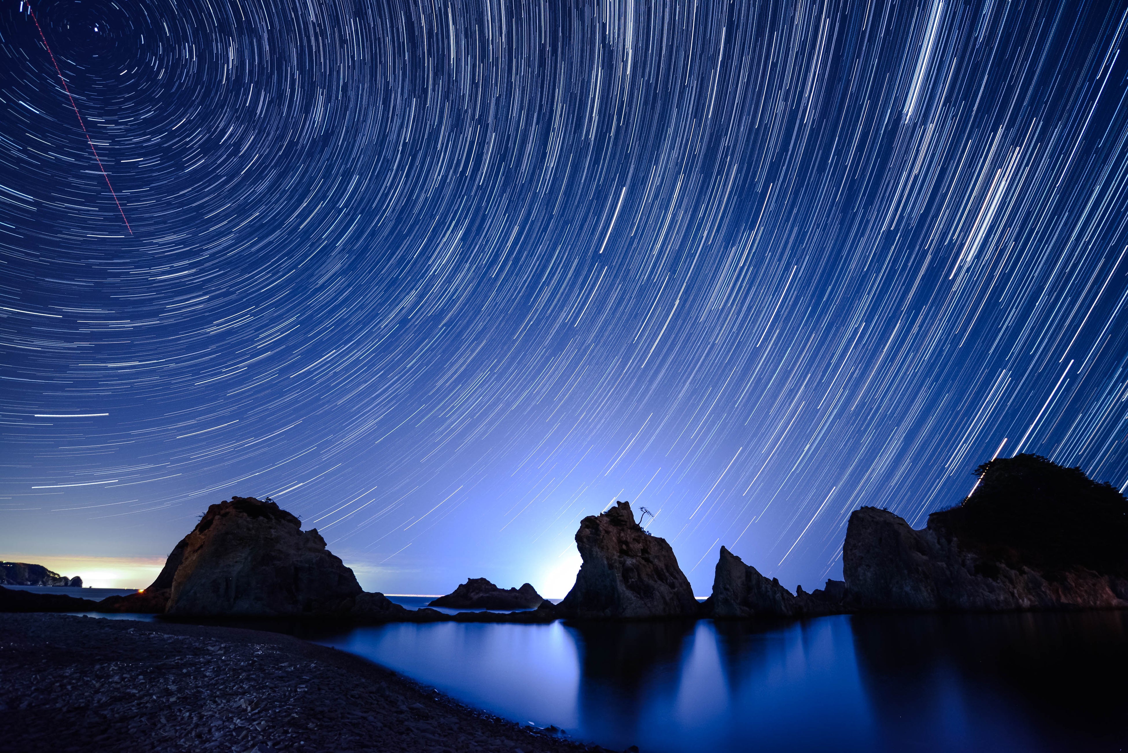 流紋岩の白い岩肌が闇夜に浮かび上がる浄土ヶ浜。澄んだ冬の空気の下、星々の軌跡が大海原を照らします。