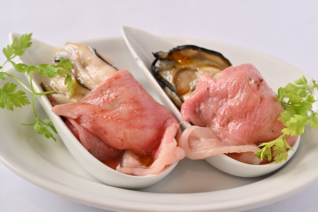広島県産カキと国産黒火乃牛A4サーロインのマリアージュ!