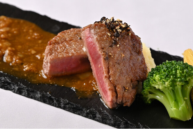 トリュフ香るキノコのソースとフォンドボーで旨味をプラス。ヒレの柔らかさと旨味を味わってください