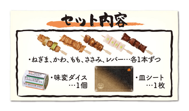 セット内容:●ねぎま、かわ、もも、ささみ。レバー…各1本ずつ ●味変ダイス…1個 ●皿シート…1枚