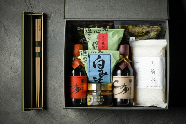 京漬物の老舗 赤尾屋のお漬物、鷹峯にて文化二年創業から今なお手作りに徹する松野?油の風味豊かな2種類の醤油や、白みそ、特選赤だしみそから、石清水八幡宮の麓で育てられた京都辻農園のお米「石清水プレミアム」まで、炊きたての香ばしい白米にお漬物やお味噌を合わせ、ご自宅での朝食を彩るアイテムとしてお楽しみいただけます。
