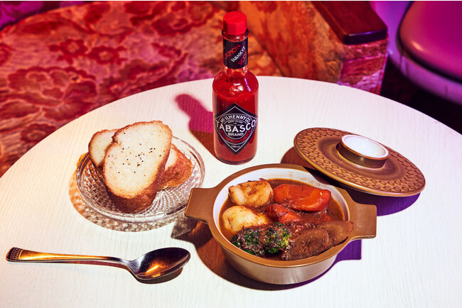 深みあるコクと、赤ワインの風味がきいた濃厚なブラウンシチュー。しっかりと煮込むことにより野菜のうまみが引き立ち、まろやかな味わいに仕上げています。胡椒とTABASCO(R)スコーピオンソースのスパイシーさがアクセントになっています。