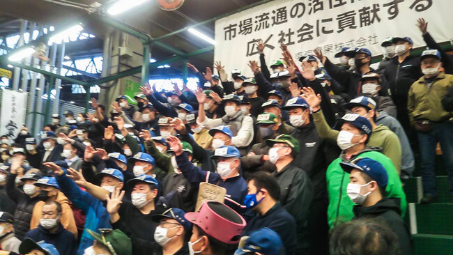 朝7時から行われた西宇和みかんの初競りには、多くの関係者が集まってくださりました。毎年注目されているのが、落札されるみかんの価格で、落札が決まった瞬間は、場内が大盛り上がりになります。
