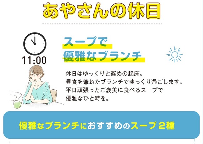 カタログの巻頭特集は「美味しい飲み物とスープのある一日」です。さらに、「郵便局のネットショップ」では、ライフスタイルに合わせて、手軽にドリンクやスープを楽しむ二人の女性の一日をイメージした「特集ページ」にて、カタログ紙面とは異なる構成で「おすすめ商品」を掲載しています。