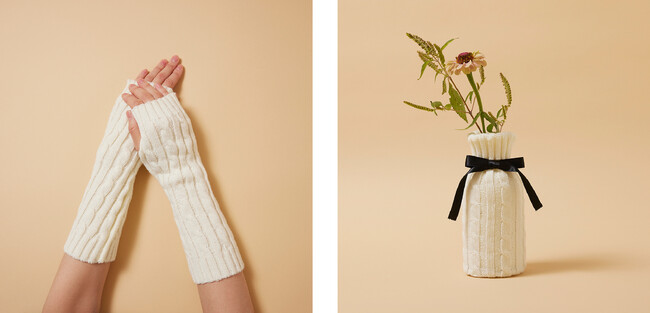 ケーブル編みのニットカバーは、アームウォーマーとしてお使いいただけます。飲み終わった後の瓶にかぶせてフラワーベースにしても。