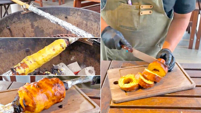 ・竹筒からゆっくりと抜き、両端をカットすればバームクーヘンの出来上がり