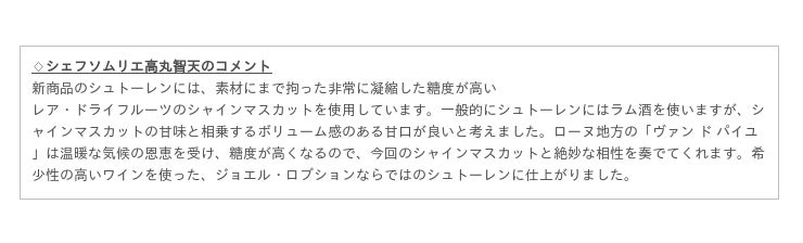 新商品『シュトーレン アンペリアル ~シャインマスカットとヴァンドパイユを使って~』は品種・造り手・熟度にこだわった最上級のシャインマスカットを厳選。レア・ドライという特殊加工によって「完熟の香り」を閉じ込め、三つ星レストラン ガストロノミー“ジョエル・ロブション”のシェフソムリエ 高丸智天が選定したワイン「ヴァン ド パイユ」に漬け込んだシャインマスカットを贅沢に使用したジョエル・ロブション最上級のシュトーレンです。表面は和三盆と金粉で飾り付け、スペシャルBOXに包み、50個限定でご用意いたします。アンペリアルという名を冠した、こだわり尽くしたジョエル・ロブションならではの逸品です。