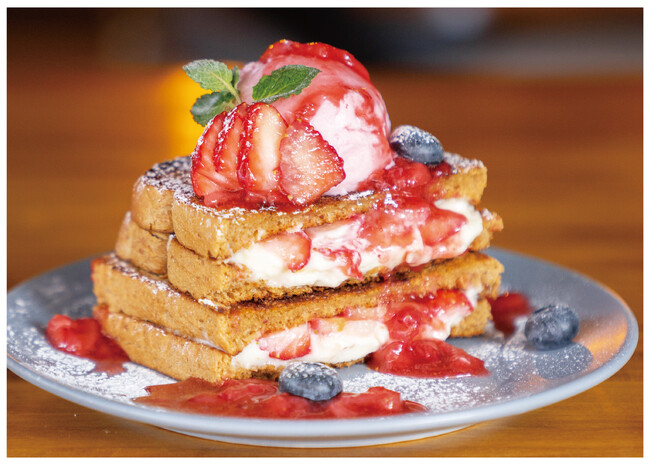 香ばしい全粒粉パンに濃厚でほのかな酸味のクリームチーズとたっぷりの苺をサンド。ストロベリーアイスや苺のソースをかけた、苺好きにはたまらない絶品デザート。