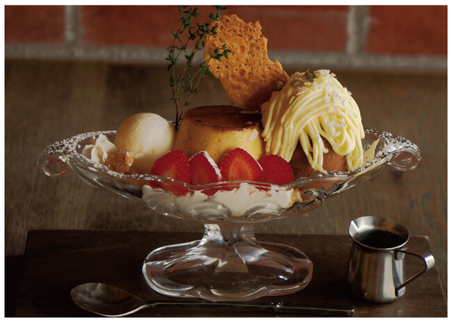 純喫茶の現代版と称されるThe CAFE(ザカフェ)からは、喫茶スイーツの定番プリンアラモードに生搾りモンブランをドッキングさせたホワイトチョコモンブランサンデー が登場。プリンは清水鶏園 海老名卵をふんだんに使い生クリームと合わせ、濃厚さを出しながらも硬めでしっかりとした食感に。