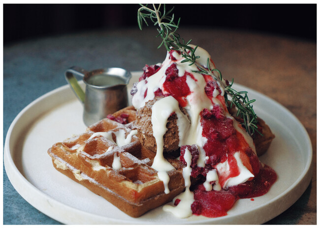 CAFE KATSUOからは焼きたてワッフルにホワイトチョコクリームをたっぷりかけた冬限定のスイーツ。