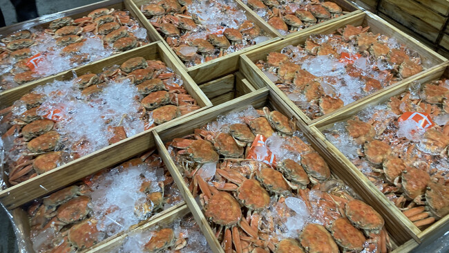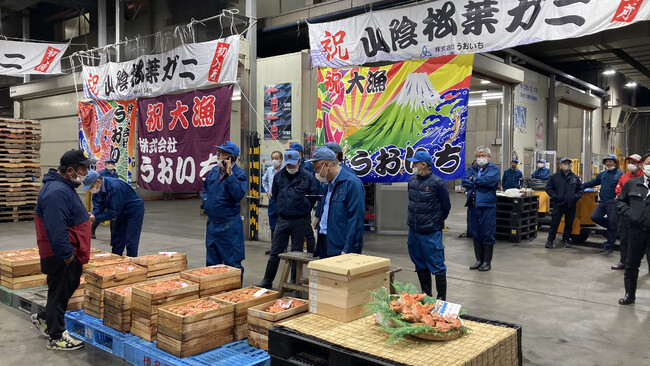 大阪中央卸売市場で初競りにかけられた「松葉ガニ」。