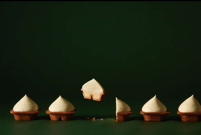 アーモンドプードルをリッチに使ったクッキー生地を熱い鉄板で挟み焼きすることで、ザクザクとしながらもしっとりコクがあり、バターの風味がより楽しめるリッチな仕上がりになっています。クッキー全体に油分で薄く膜を貼ることで、上に載せる生チーズスフレの水分移行を止め、ザクザク食感が長持ちするように工夫しています。