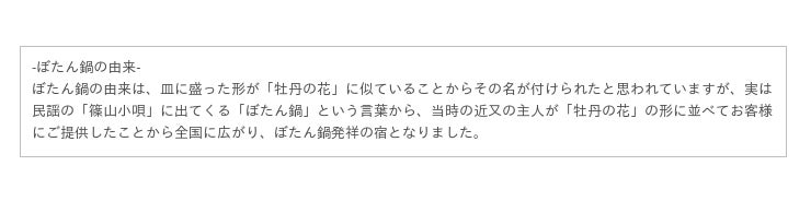 また、昭和54年11月現令和天皇、浩宮徳仁親王殿下にも御宿泊を賜り、当館のぼたん鍋をご賞味いただいております。春、夏は地元の食材をふんだんに取り入れた会席料理を、秋は松茸会席を、そして冬はぼたん鍋と四季折々のお料理お召し上がりいただける、歴史ある料理旅館です。