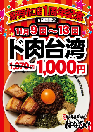 飲食店を中心に事業展開する株式会社ヴィア・ホールディングスの子会社である株式会社紅とん(東京都新宿区 代表:楠元 健一郎)が運営する「麺屋はなび高円寺北口店」が、おかげさまで、開店1周年を迎えました。この度、1周年を記念して、人気商品の「ド肉台湾まぜそば」を1,000円(税込)でご提供致します。「ド肉台湾」とは、存在感がたっぷりのド肉(食べ応え抜群なドデカチャーシュー肉)と、台湾ミンチ(唐辛子とニンニクを効かせた醤油味ピリ辛ミンチ)が、ゴロゴロっとたっぷり乗っている食べ応え十分のまぜそばです。