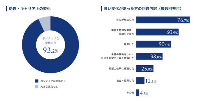 回答者の93.2%が「処遇・キャリア面でポジティブな変化があった」と選択。内訳をみると、過半数が「年収が増加した」「業務で業績・実績を上げた」と回答している。