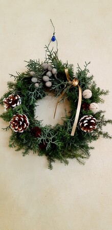 ヒバ類を直径15~20cmのリース台に括り付ける、クリスマスリース作りのレッスンを開催します。約1時間で完成する気軽なレッスンですので、ご家族そろってご参加ください。同日に正月飾りづくりも開催します。