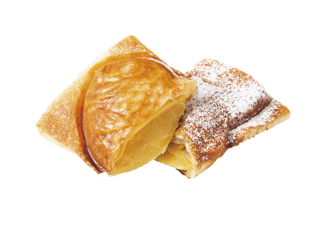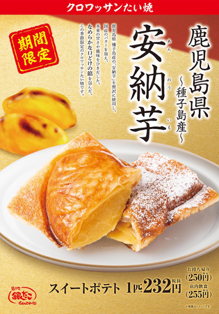 クロワッサンたい焼 『安納芋 スイートポテト』(上)は、鹿児島県産種子島産の「安納芋」を使用し、甘さが強く、加熱するとねっとりした口どけが楽しめるのが特徴で、国産バターを加え、特製のスイートポテト餡をサクサク食感のオリジナルクロワッサン生地に包みこみ、仕上げに見た目も華やかな粉糖を表面(片面のみ)に振りかけたクロワッサンたい焼です。