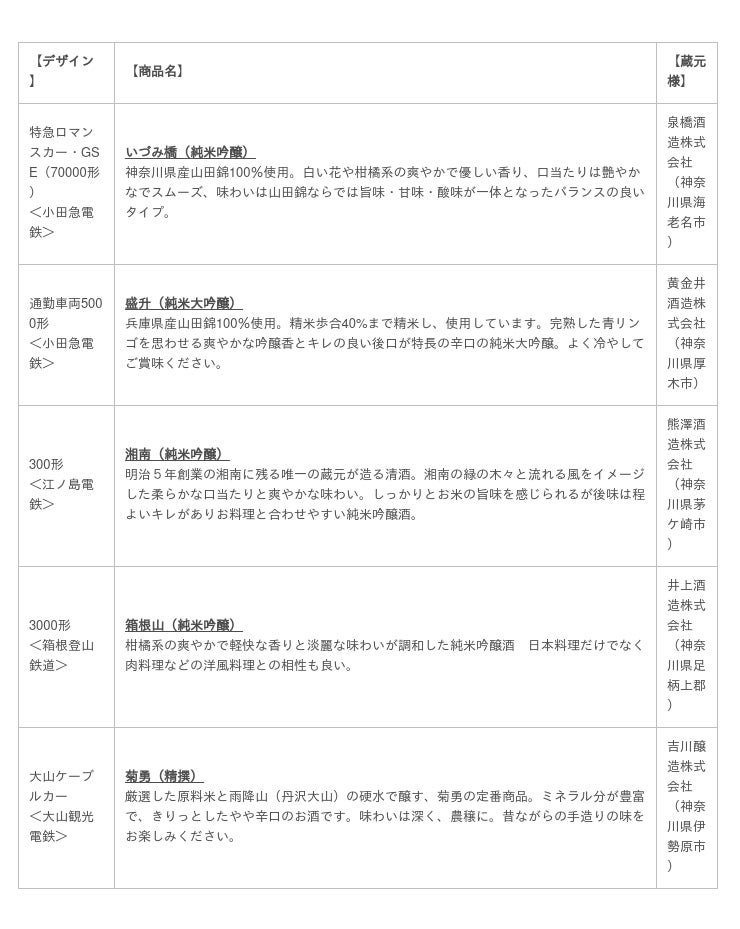 なかなか旅行に出かけられない今のご時世、少しでも旅の気分を楽しんでいただければと思い、小田急グループ各社のデザインで作り上げた5種類の日本酒缶です。