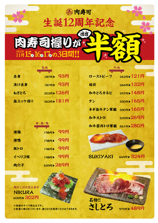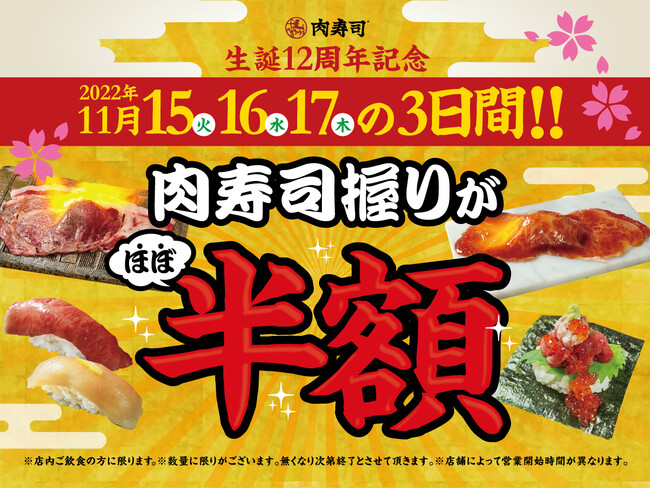 そして、多くのお客様にご愛顧いただき、今年で創業12周年を迎えることができました。今回、これを記念して、これまで支えてくださったお客様への感謝を込めて、大人気メニューの「さしとろ」を含む、19種類のメニューを、2022年11月15日(火)から11月17日(木)の3日間限定で、半額という特別価格でご提供いたします。ぜひお近くの肉寿司へご来店ください。皆様のご来店を従業員一同、心よりお待ちしております。