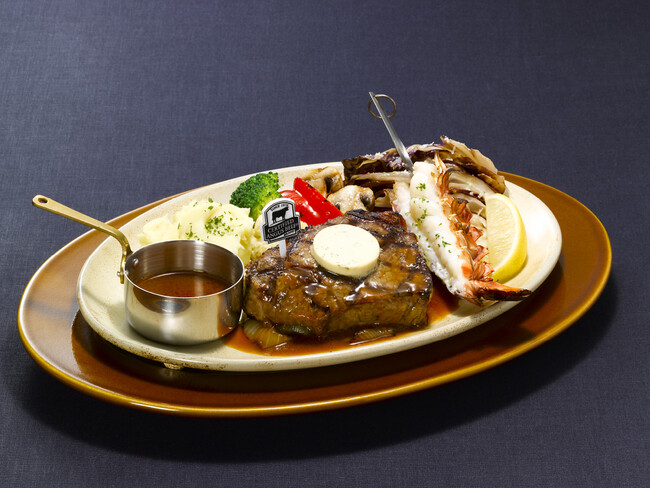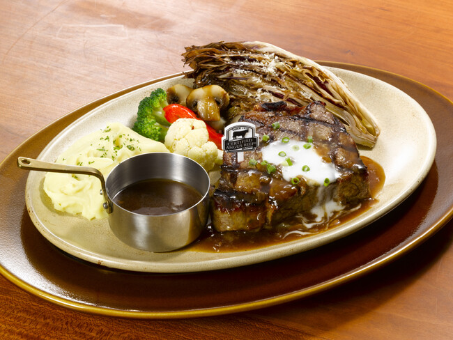 こだわりのCAB(R)アンガスサーロインの厚切りステーキや、オマール海老との組み合わせメニューを継続してご提供。付け合わせには、マッシュポテトと国産トレビスなど季節を感じられる数種類のグリル野菜を添えています。