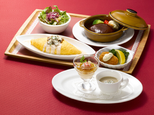 オムライスは、ふんわりとした卵で巻き上げたトマト味のチキンライスに、トリュフ風味のクリームソースをかけ、バターソテーしたマッシュルームをトッピングし、一層香り豊かに仕上げています。肉料理には、ロイヤル自慢のドミグラスソースで煮込んだハンバーグに彩り野菜を添えました。マッシュルームスープとコンソメジュレ&フラン仕立て~蟹~の前菜から始まり、メインには定番の紅ずわい蟹のクリームコロッケまで付いた、ごちそう感たっぷりの洋食小皿です。