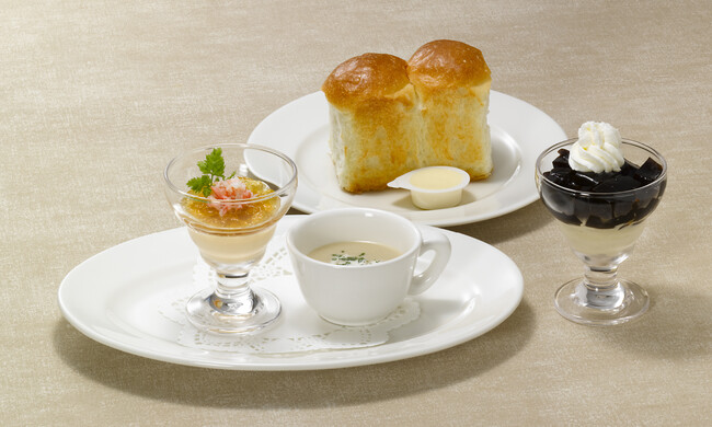 冬の洋食小皿は、前菜に「マッシュルームスープ」を添えて温かさをプラス、ジュレには冬を感じる蟹をトッピングしました。メインは寒い季節にぴったりな「煮込みハンバーグ」と香り高いトリュフクリームソースを合わせた「オムライス」など蟹やトリュフといった贅沢な素材が味わえるメニューです。