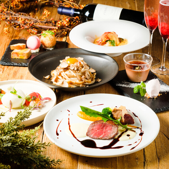 黒トリュフのかけすぎカルボナーラ 、平目のポワレ、黒毛和牛フィレ肉ローストなど全7品のクリスマスディナーコース