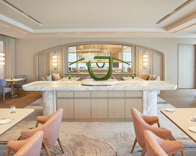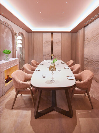 ダスティピンク、ベージュ、サンドの色調でまとめられた居心地のよいプライベートサロンは、料理芸術の真髄を堪能できる空間で す。真鍮とオパールガラスで作られたウォールランプで囲まれたアイボリーの大理石の暖炉は、その丸みを帯びたフォルムが一瞬 にしてゲストの目を引きつけます。官能的な雰囲気は、アンドレ・フー・リビングのサーモンピンクのブークレ生地のチェアと、ベー ジュ、ダスティピンク、サンドの落ち着いたカラーリングでさらに強調されています。照明デザインも劇場のような感覚でテーブル を照らし、ダニエルのエレガントな料理を引き立てます。