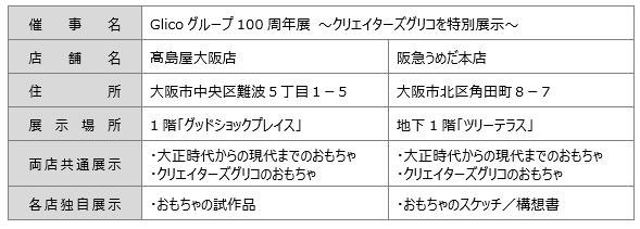 大阪で発売を開始した栄養菓子「グリコ」は、今年で発売から100周年を迎えました。「キャラメル」と「おもちゃ」が一つになった同商品のおもちゃの数は約3万種類55億個にのぼります。この度、それらのおもちゃの一部と、特別商品「クリエイターズグリコ」のおもちゃを展示する「Glicoグループ100周年展 ~クリエイターズグリコを特別展示~」と題した催事を「高島屋大阪店」と「阪急うめだ本店」の両店にて共同実施します。