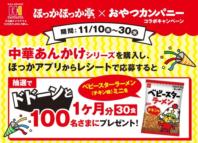 株式会社おやつカンパニー(所在地:三重県津市 代表取締役社長:手島文雄)は、日常の中で忘れがちな、あの頃のワクワクする気持ちをお届けしたいとの想いから、おやつの常識にとらわれず挑戦し続けるベビースターならではのオモシロいコラボ企画を、いろいろな業界・いろいろな場所・いろいろなシーンで展開しています。「#おやつの常識を越える」第16弾は、「ほっかほっか亭」×ベビースターの中華コラボ!2022年11月10日(木)~11月30日(水)の期間中に、「ほっかほっか亭」中華あんかけシリーズを購入し、「ほっかアプリ」から購入レシートで応募すると抽選で100名様にベビースターラーメン約1か月分をドドーンとプレゼントします。さらに、「ほっかほっか亭」の公式Twitterでもコラボキャンペーンを実施します。ベビースターラーメン(チキン味)は、中華あんかけや八宝菜との相性も抜群!ベビースターのトッピングでパリポリ食感も味変も楽しめる「ほっかほっか亭」×ベビースターの期間限定コラボキャンペーンを是非、お楽しみください。