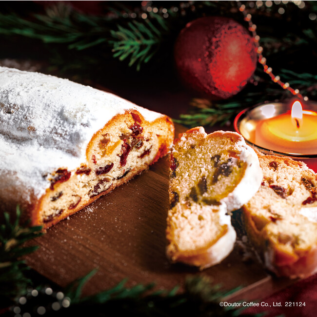 クリスマスを待つ期間に、少しずつスライスして食べるシュトーレン。バターを練り込んだ生地に、ラムレーズン、クランベリー、グリーンレーズン、オレンジ、クルミを入れて焼き上げました。