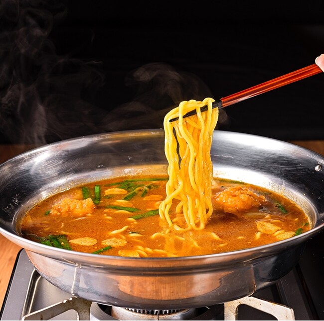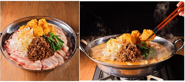 ジュワッと揚がった鶏のからあげをコク深い胡麻担々へダイブさせた「鶏から 胡麻坦々鍋」は、一見、不健康に見えますが、実はたっぷりの野菜を使っている健康的なジャンク鍋です。〆は、にんにくラーメンで存分にお楽しみください。