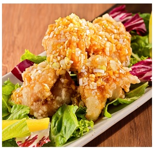 ジューシーに揚げたアツアツの唐揚げに、甘酸っぱい?油ベースの油淋ソースをかけた中華の代表的な料理です。たっぷりの長葱のみじん切りで唐揚げの風味をアップいたしました。
