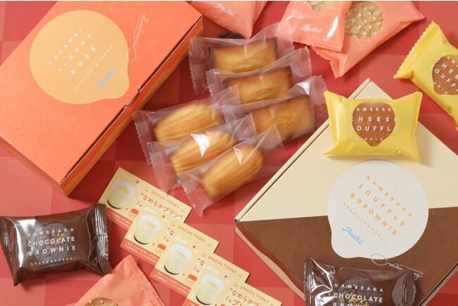 ・内容:キャラメルアーモンドラスク 12枚入、マドレーヌ 3個、フィナンシェ 3個、なめらかスフレ&ブラウニー 8個入(なめらかチーズスフレ 4個、なめらかチョコブラウニー 4個)、なめらかプリン引き換え券 4枚