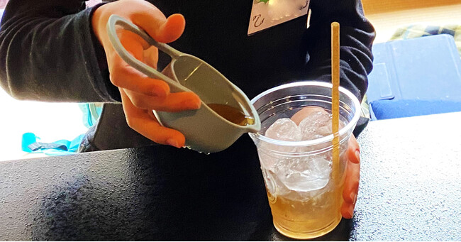梅シロップを色々な割り材で割って、色合いの変化を知ってもらいました。