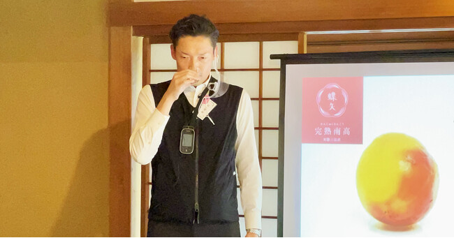 蝶矢の梅マイスターから味と香りを見極めるテイスティングの方法や梅の産地や歴史について教わった後、実際に品種の異なる5種類の梅シロップをテイスティングし、テイスティングシートを作りました。