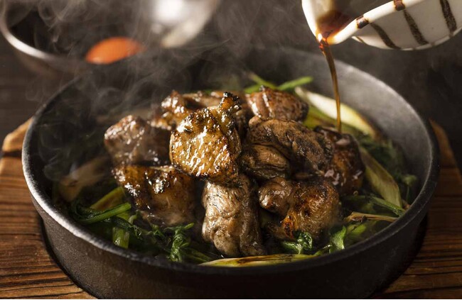 炭火で焼き上げた地鶏のモモ・手羽元を、食欲高まる香と食感が楽しい九条ネギと春菊の上に載せ、特性の割り下で絡め焼きします。