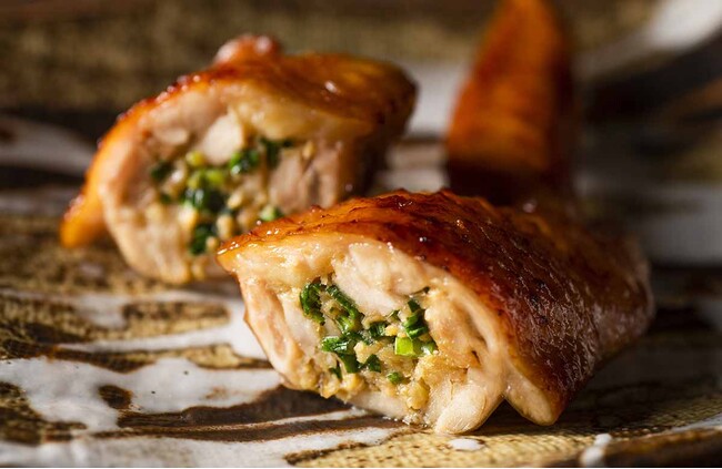 冬に旨味と香りが最高の状態を迎える新鮮なニラを、地鶏のフィリングと共に手羽にぎゅうぎゅうに詰め込みます。
