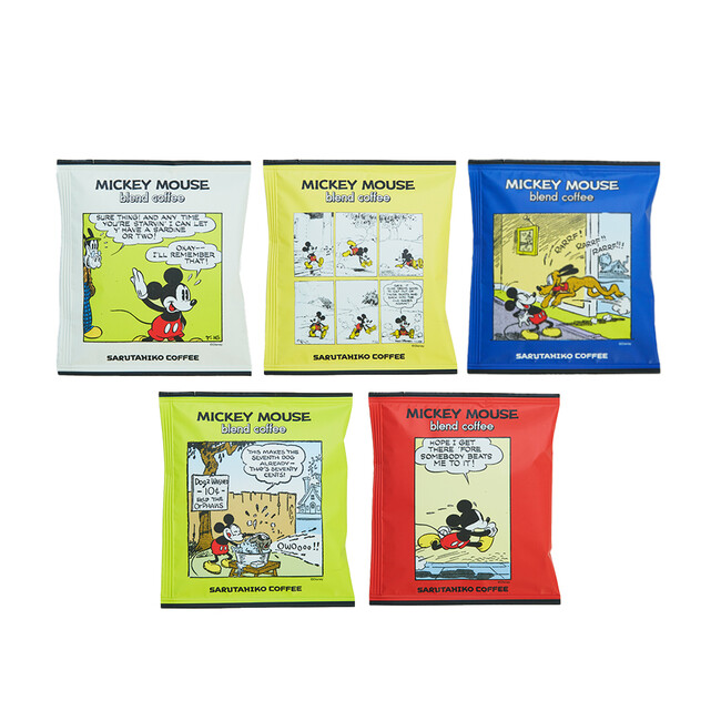 ディズニー初期のミッキーのコミカルなワンシーンを切り取った、可愛らしいパッケージのドリップバッグが登場!ブレンドはミッキーをイメージしたダークチェリーの甘さやリッチチョコレートのような滑らかな余韻が味わえるブレンドで、ブラジル・エチオピア・コロンビアの豆を中深煎りに焙煎した芳醇なブレンドです。
