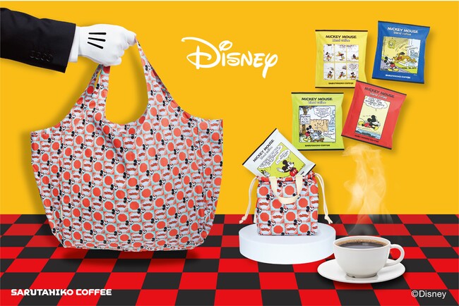 発売となるのは猿田彦珈琲がミッキーをイメージして作成したオリジナルブレンドと、リユーザブルバッグの2種類のアイテム。オリジナルブレンドはドリップバッグタイプとなっており、パッケージにはミッキーのコミカルなワンシーンが描かれたデザインのものが5種類/1セットに。猿田彦珈琲のロゴとしても象徴的な八角形のモチーフとミッキーを組み合わせた総柄のミニバッグに入っています。リユーザブルバッグは同じ柄のポリエステル製バッグで、ちょっとしたお買い物にもぴったりなサイズ感。小さく折り畳みも可能です。
