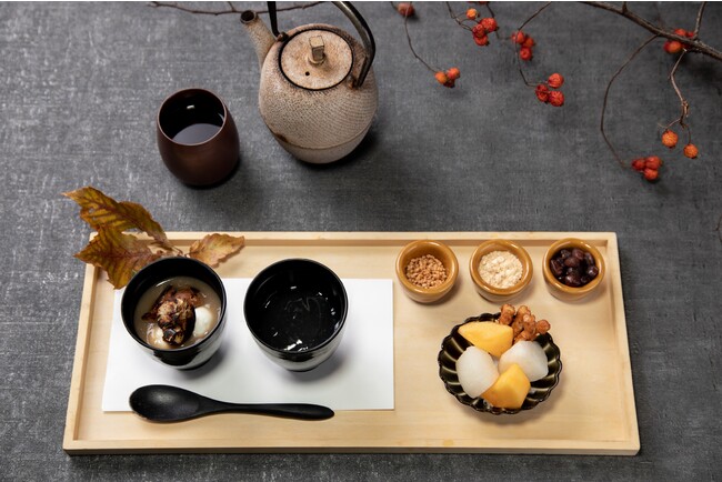 箸休めには、季節のフルーツ(柿と梨)と味噌専門店から仕入れた味噌かりんとうをご用意し、独自の製法で淹れた栗茶とセットでお召し上がりいただける逸品です。