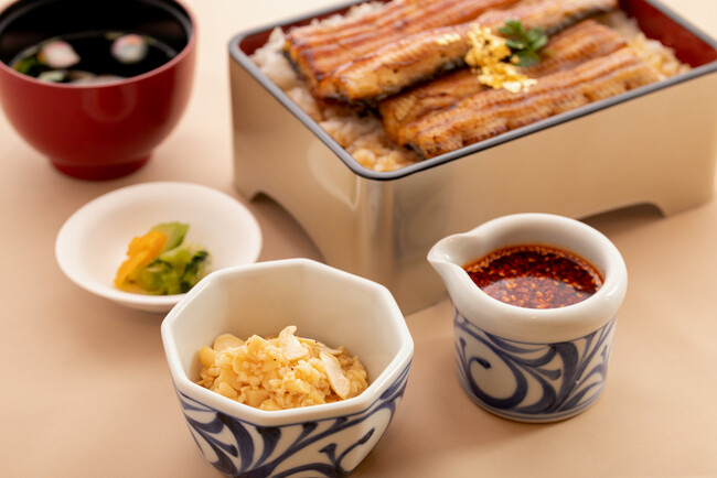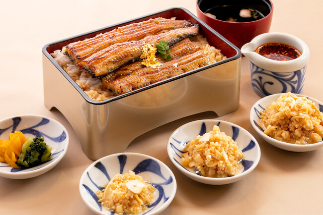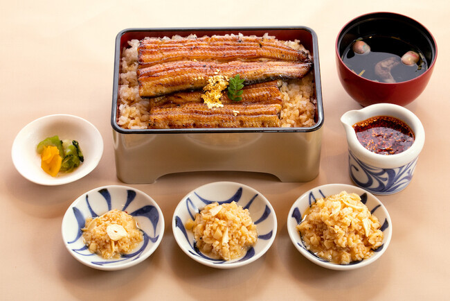 『プラチナにんにく うな重』は、特製調味料を合わせた“刻んだニンニク”と“赤いピリ辛タレ”を添えたうな重です。ニンニクと一緒に召し上がることで、奈良時代から知られる「うなぎの滋養」効果アップが期待でき、さらに鮒忠秘伝のうなぎのタレ、ニンニク独自の食感、ピリ辛タレと3つの異なる味の変化をお楽しみいただけます。また、ニンニクの増し加減はお好みで5段階からお選びいただけます。