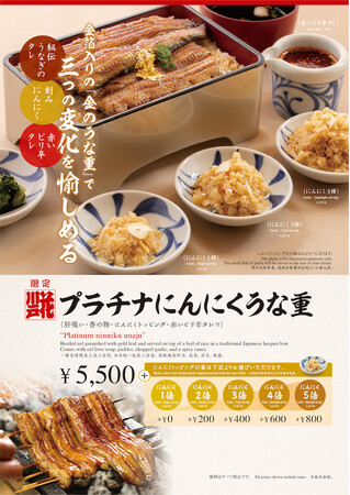 内 容:花川戸店特製「金のうな重」、トッピング用ニンニク、赤いピリ辛タレ