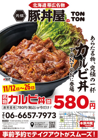 北海道・帯広豚丼が人気の「元祖豚丼屋TONTON 駒川店」(住所:大阪府大阪市東住吉区駒川4-11-24、TEL:06-6657-7973)に新メニューが登場!11月12日(土)~26日(土)に限り「カルビ丼【並】」を期間限定価格580円(税込)で提供いたします。