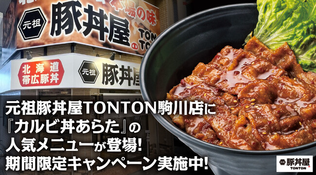 ワンズトライン株式会社(本社:大阪市北区芝田2丁目3番16号、代表取締役:山内仁)が運営する、本場・北海道帯広の本場豚丼をボリュームたっぷりに味わえる「元祖豚丼屋TONTON 駒川店」に、『カルビ丼あらた』の人気メニューが登場いたします。